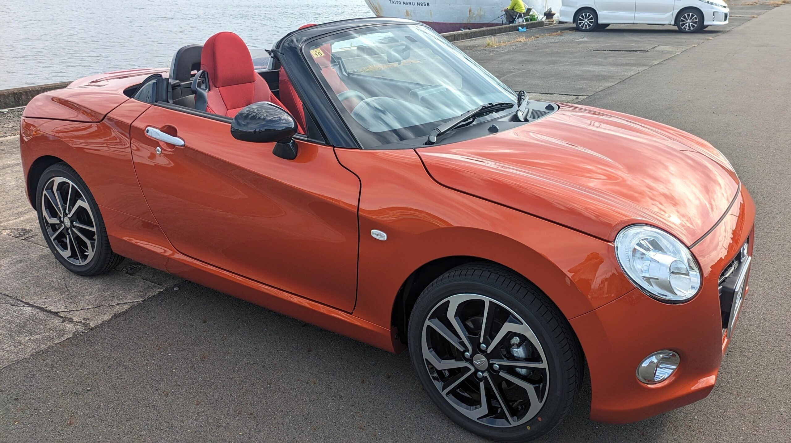 ボディーカラーでさんざん悩んだ挙句、やっぱりトニコオレンジメタリックしか考えられず、でも全く同じじゃ芸がないと思い、せめて内装を変えようとなって、ベージュから赤にしました。