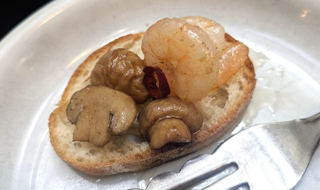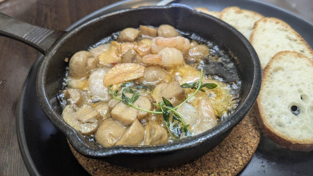 パスタ前のヒトサラより、「海老とマッシュルームのアヒージョ バゲット付き」。