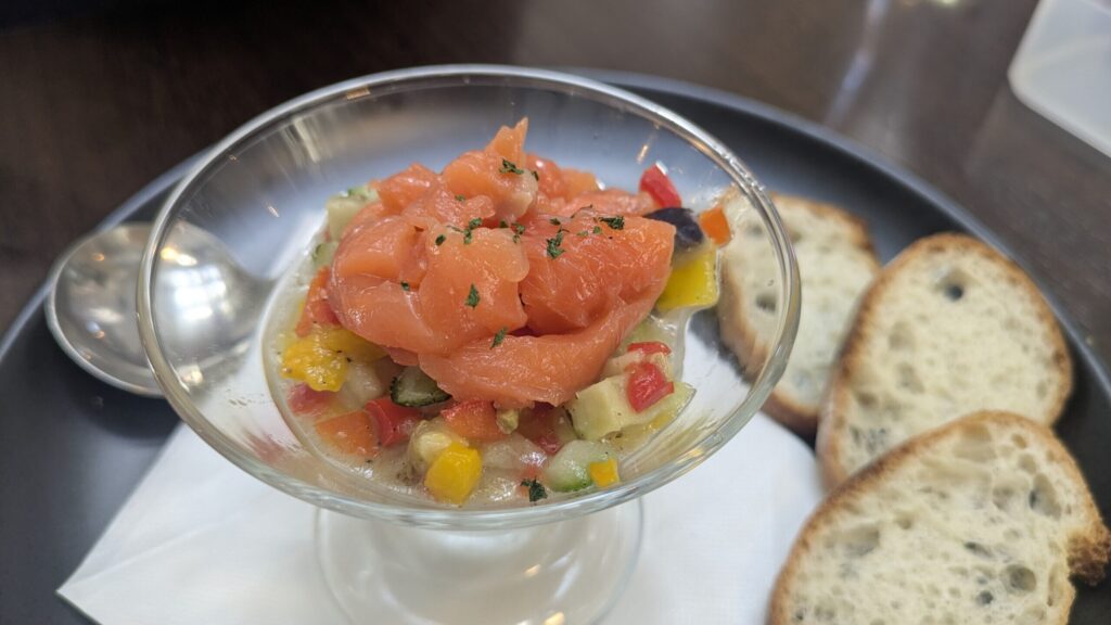 濃厚なサーモンとさっぱりとした野菜ソースがとても相性よくて美味しい。