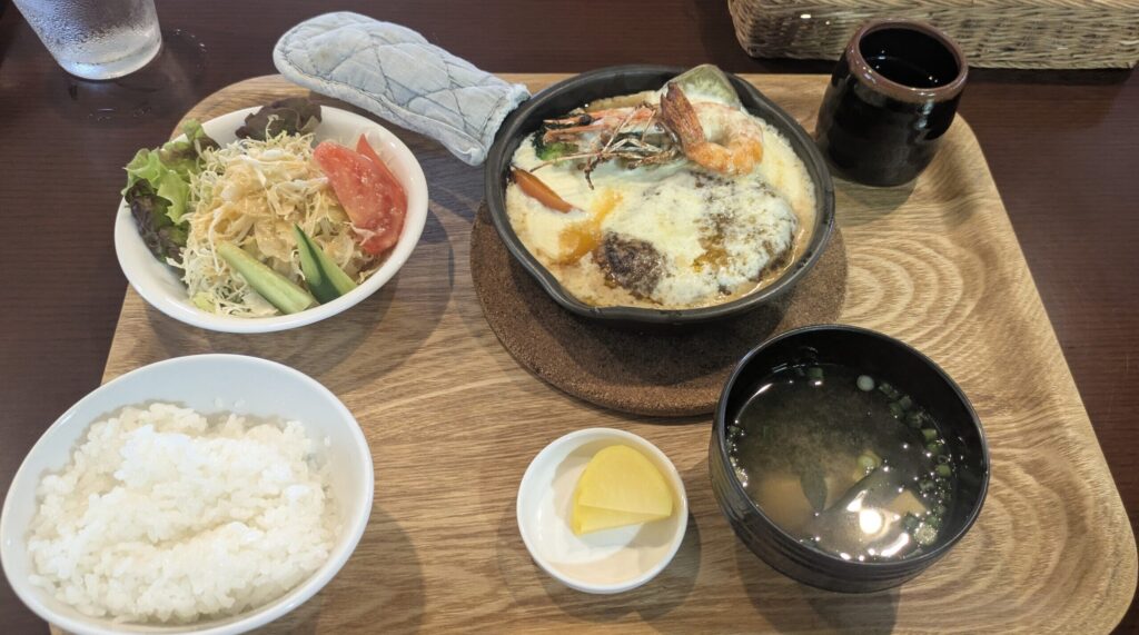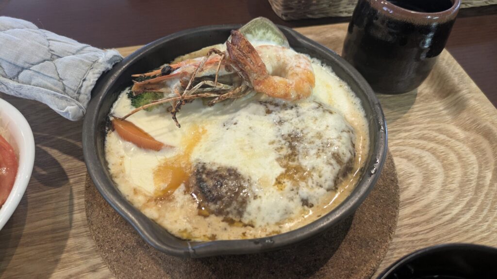 今回は夫が「トリムランチ」、私はネーミングがユニークで気になった「チーズにオボレタ海老とハンバーグ」にしました。