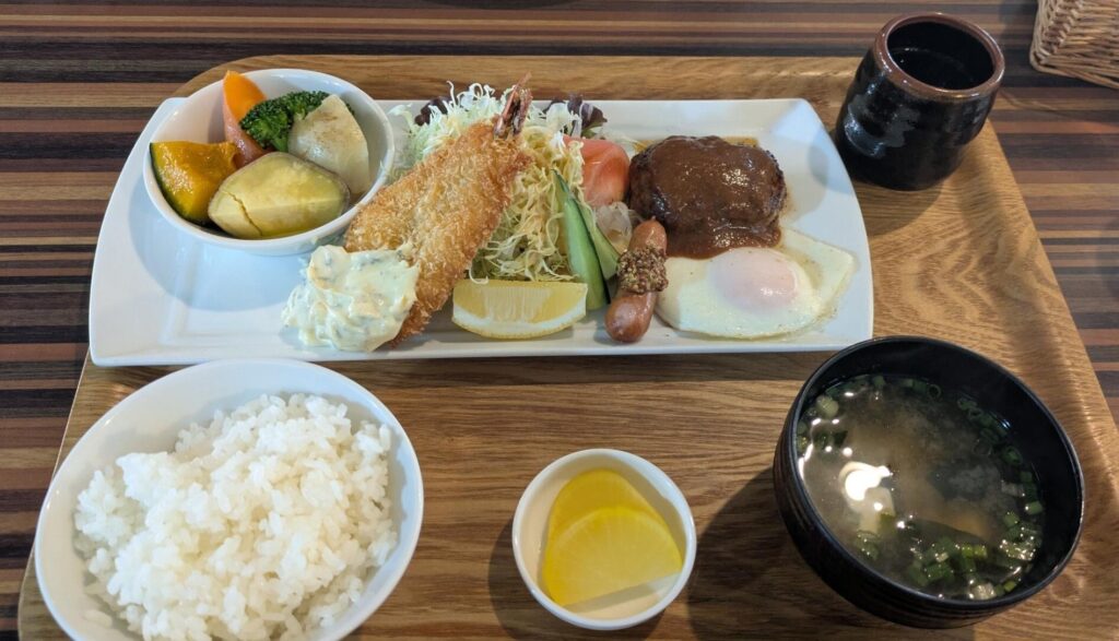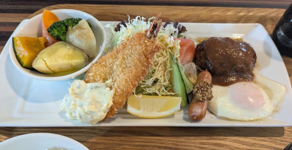 ハンバーグにエビフライ、目玉焼きにウインナーと盛りだくさん。